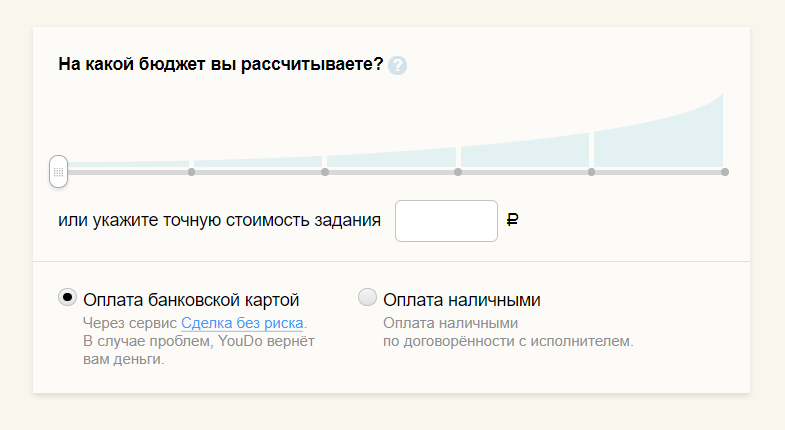 Заказчик может принять ваше предложение или предпочесть оплату наличными. Если вы хотите работать только со Сделкой без риска, откликайтесь на те задания, в которых выбрана оплата банковской картой.