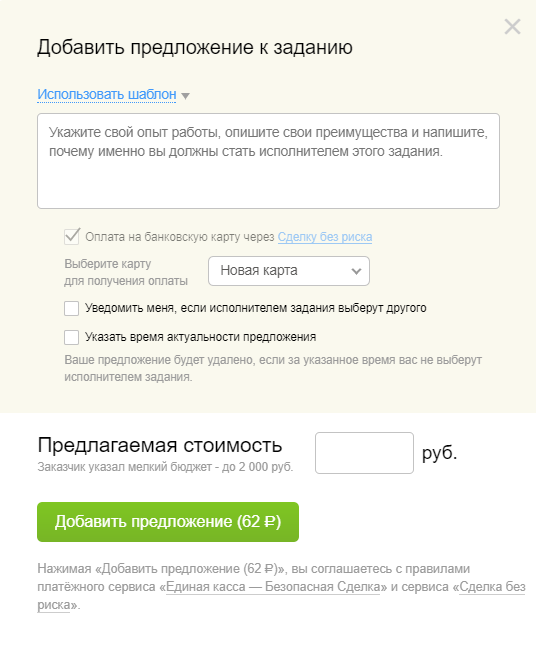 Если в задании нет значка «Сделка без риска», предложите заказчику воспользоваться данным сервисом. Выберите способ оплаты банковской картой, когда будете отправлять предложение к заданию.